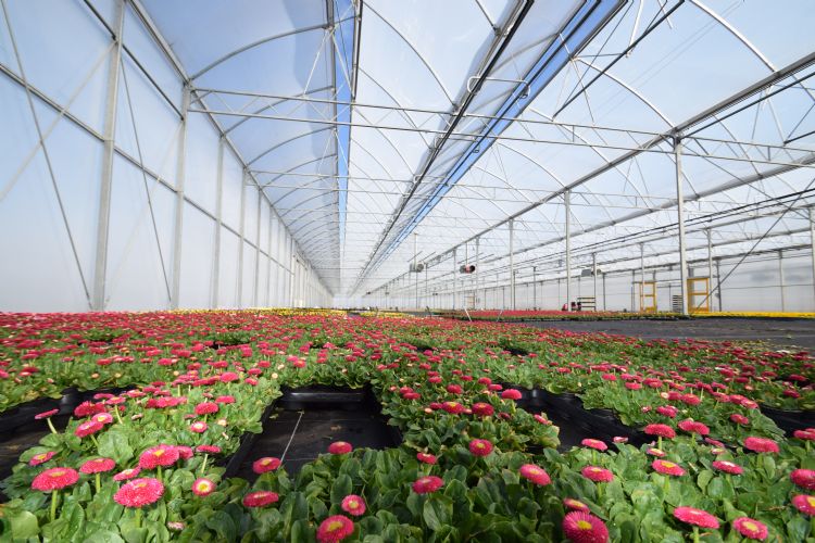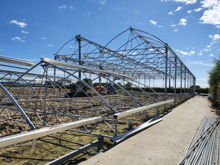 Kwekerij Maes-Reyns groeit door en heeft te weinig plaats om binnen door te telen. De huidige foliekas is ruim 30 000 m2 en voldoet niet meer qua benodigde ruimte. Vandaar de uitbreiding met nog een foliekas van 8000 m2. Maes-Reyns: 'Het hele jaar door hebben we een ruime keuze in vaste planten met extraatjes die bloeien voor verkoop in de zomer. We hebben Viooltjes, Geraniums of Pelargonium en andere balkonplanten in het voorjaar. In het najaar ligt de nadruk meer op planten met kleurrijk blad, zoals Heuchera en Gaultheria, zodat je ook in de winter een mooie plantenbak kunt samenstellen. We verkopen veel aan Belgische en Franse winkels; de grens is hier dan ook vlakbij. Daarnaast verkopen we ook in Engeland en Zwitserland, via groothandelaars. Dat zijn onze grootste markten. In de nieuwe kas komen in het voorjaar balkonplanten en in de winter wordt de ruimte ingezet voor het overwinteren van vaste planten.' Het bouwen van deze kas doet Vermako met één team en dat neemt drie à vier weken in beslag. 'We monteren alles op de grond en liften de bovenbouw inclusief palen met een kraan, zodat we niet elke keer afzonderlijk naar boven hoeven.'