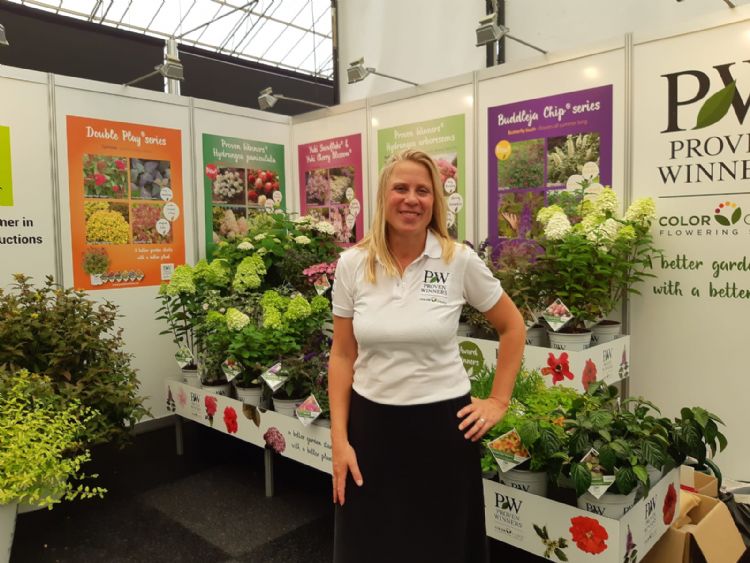 Samen met internationale collega's bemenst Esther Wientjes de stand van Valkplant: de aandacht gaat vooral uit naar Proven Winners 'Met dit programma halen we nieuwe planten, vooral uit de VS, om hier in de markt te introduceren. In onze eigen proeftuin bekijken we welke planten echt iets toevoegen voor de Europese markt om toe te laten tot het programma.'