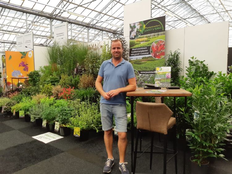 In de stand van Joost Sterke staan de planten er opvallend fris bij. 'We zijn hier vooral voor de contacten, om mensen weer face to face ontmoeten,' vertelt Dennis Konings. 'Wij geven hier een beeld van ons assortiment, in elk geval het deel dat er nu mooi bij staat.'