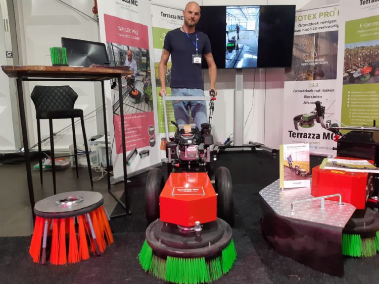 De Geotex Pro van Terrazza heeft verschillende borstels voor vegen, schoonmaken en onkruid verwijderen van de teeltvloer. 'Voor onze klanten is belangrijk om lastig vuil zoals algen en groene aanslag efficiënt te verwijderen en daarbij geen chemie nodig hebt', vertelt Dieter Mesdag.