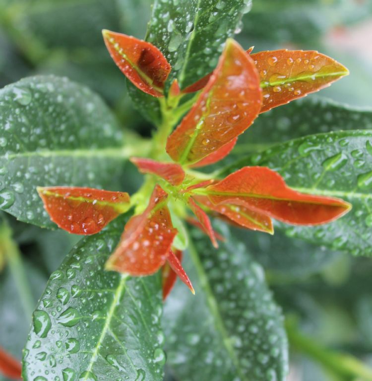 | | Close-up van Prunus 'Bonaparte': compacter en met meer rood dan 'Etna' |