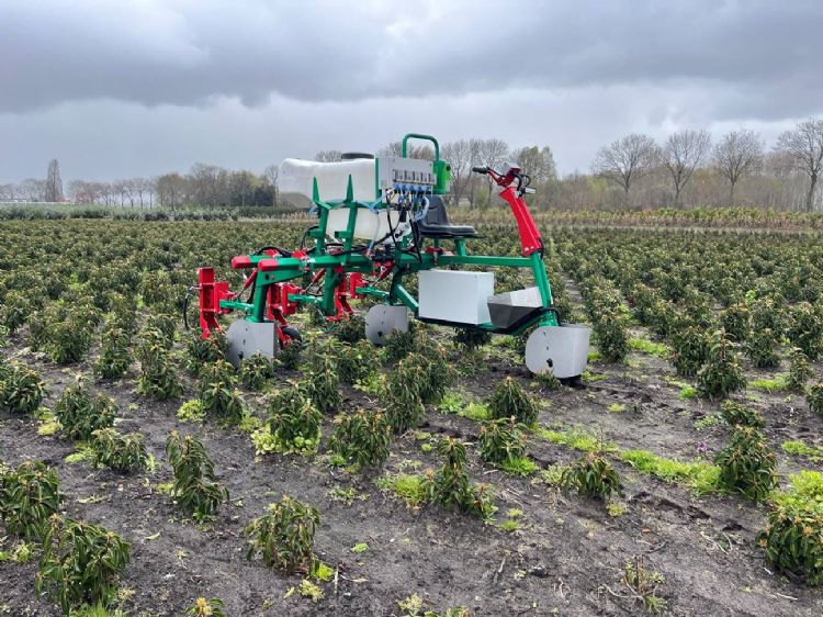 Je loopt dus achter deze portaalmachines en stuurt ze met handkracht. Ze zijn bestemd om gaten te boren, te vormsnoeien, kluiten te steken en vanzelfsprekend om te schoffelen. De werktuigen hiervoor zijn opgehangen aan een frame, dat horizontaal en verticaal aanpasbaar is vanwege de rijafstand en bijvoorbeeld de hoogte van het kwekerijproduct. Uiteraard zijn er verschillende uitvoeringen van de werktuigen, die bij diverse formaten en uitvoeringen plantgoed passen (bijvoorbeeld piramidaal of bolvormig). Spekschate: 'Die kluitensteker bracht ons trouwens op een idee. Deze leent zich er namelijk ook voor om diepwortelende onkruiden te verwijderen. Hiermee kun je de wortels van bijvoorbeeld smalle weegbree, paardenbloem, ridderzuring en sint-janskruid onder het maaiveld doorsnijden. Daardoor verliest de plant zijn groeikracht. Uiteindelijk resulteerde dit in een machine die we hebben uitgerust met drie camera's. Die herkennen de onkruidplant met behulp van Vision-software en artificial intelligence. Eén van de acht beitels per camera snijdt vervolgens de wortel onder het maaiveld door.'