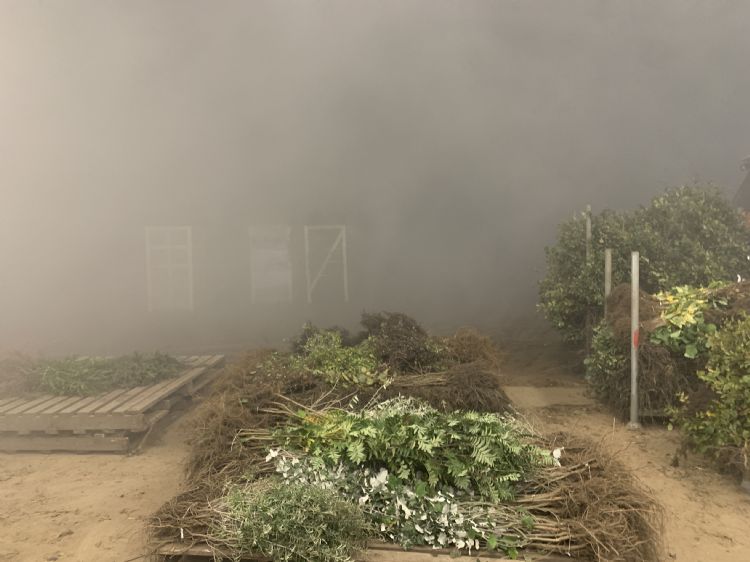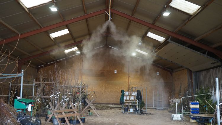Terwijl een vorkheftruck een pallet met plantgoed door de hangardeur bij Sylva Boomkwekerijen naar buiten rijdt, laat manager Lieven De Backer een blik in zijn grote loods werpen. Hier zou het KNMI absoluut de kwalificering 'code rood' geven. Door de mist die erin hangt, zie je geen hand voor ogen. Het SD-Air-systeem van Agricult blijkt hier voor een droge waterdamp te zorgen, waardoor je de achtergevel absoluut niet kunt zien. Sylva Boomkwekerijen is in 2020 via dealer Intergrow in samenwerking met Agricult gaan werken met dit innovatieve systeem. De Backer vertelt dat hij hiermee in een oudere loods is gestart: 'Na ervaringen met vernevelingsdoppen die ongewenst bléven nadruppelen, hebben we contact opgenomen met Agricult. Eerst vernevelden we daar water met één verstuiverset van het SD-Air-systeem dat zij ons voorstelden. Later hebben we daar een tweede verstuiverset bij geplaatst.