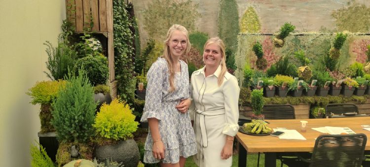 Marylène Buitenhuis en Nienke van Waaij van Koos Buitenhuis boomkwekerij krijgen veel complimenten van de bezoekers over de stand en het assortiment.