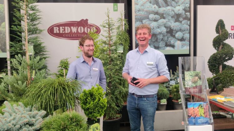 Bram Timmerman en Wouter Vrielink van Boomkamp boomkwekerijen laten de nieuwe lijn Redwood zien, een sortiment reuzennaaldbonen zoals de Metasequenao.