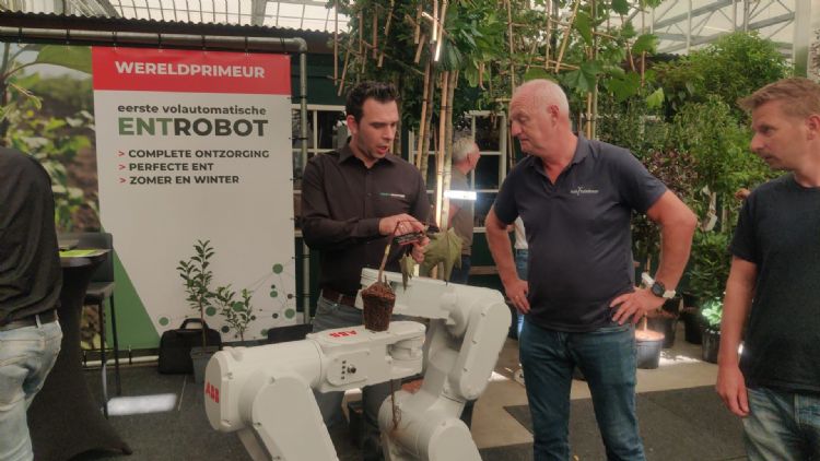 We ontmoeten normaals de stand van HortiGrafting. Gerrit Baars vertelt honderd uit over de Entrobot. Deze robot ontzorgt de vermeerdering, next level enten. Meer capaciteit? Dan kun je zo opschalen.