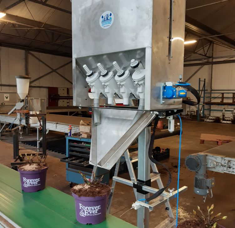 Een van de machines die Jongenelen zelf heeft ontwikkeld en laten bouwen, is de Potbemester XL, een topdressmachine. Deze strooit per plant de meststoffen op de potgrond en kan tot vier verschillende soorten meststoffen mengen. 'Meststoffen op de potgrond leggen heeft als grootste voordeel de flexibiliteit. Wie tien of tientallen soorten planten kweekt, kiest vaak voor één soort potgrond, vermengd met meststoffen als een soort gemene deler. Dat is eigenlijk voor bijna geen enkele pot optimaal. Vaak wordt dit op het veld nog wel geoptimaliseerd, maar het kan zoveel gemakkelijker door tijdens het oppotten al de juiste samenstelling van meststoffen toe te passen. Wat mijn machine uniek maakt, is dat je tot vier types meststoffen tegelijk kunt toedienen. Zo haal je er teelttechnisch veel meer uit.'