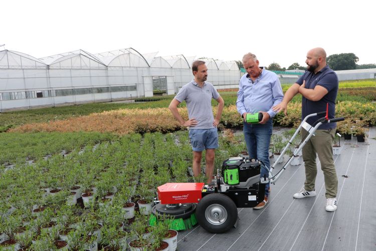 De Nolf streeft ernaar om onkruid niet met bestrijdingsmiddelen te lijf te gaan. 'Op het moment dat er vuil of aarde op het gronddoek komt, ontstaat er onkruid op het doek en in de potten. Belangrijk is om op dag één met een perfecte omgeving te starten en het doek gedurende het jaar schoon te houden. Daarom is het voor ons belangrijk om propere doeken te hebben en de reinigingsmachine van Terrazza te gebruiken. Deze zetten we al een aantal jaren in om onze containervelden te reinigen, en we hechten veel belang aan het welzijn van onze werkmensen. En de machine van Terrazza verlicht en versnelt het werk en reinigt heel goed.'