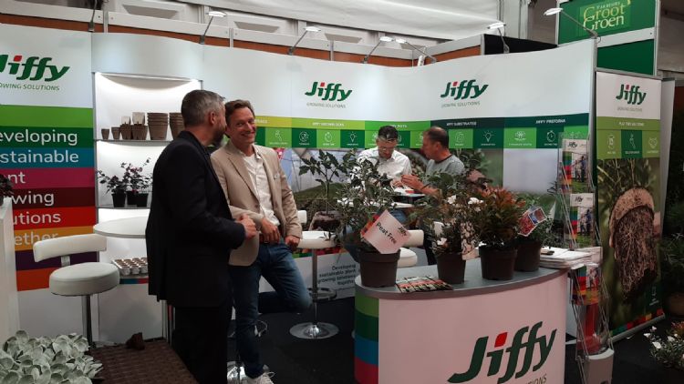 De jongens van Jiffy Products zijn al meteen druk in gesprek.