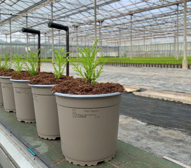 'We voegen ook bark toe aan de potten,' vertelt Vermeer. 'Ook dat gaat geautomatiseerd. Wij brengen onze barkmachine mee en voegen deze toe aan de lijn. Dankzij de bark ontstaat er minder onkruid, zijn er minder bestrijdingsmiddelen nodig, waardoor het ook minder werk vraagt. Bovendien zien de potjes er met bark fraai uit.'