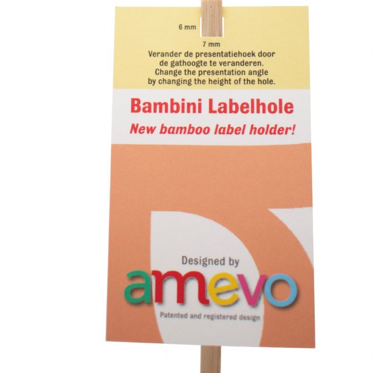 Het assortiment van de bekende bamboe-etikethouders van Amevo, Bambini, wordt uitgebreid met een nieuwe variant. Dankzij deze Bambini Labelhole blijven etiketten in een mooie hellingshoek staan, waardoor het voor de eindklant eenvoudiger is om het etiket te lezen. 'Wij hebben dit ontwikkeld naar aanleiding van vragen uit de markt.'