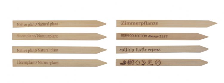 Een ander populair bamboe product is de etiketsteker waarin met laser een boodschap gebrand wordt. 'Het heeft een organische uitstraling; dat wordt aantrekkelijk gevonden', merkt Van Dorp. 'We gebruiken hiervoor diverse lettertypes, waardoor het etiket er handgeschreven uitziet. De klant levert de informatie en het gewenste lettertype en wij verzorgen de rest.'