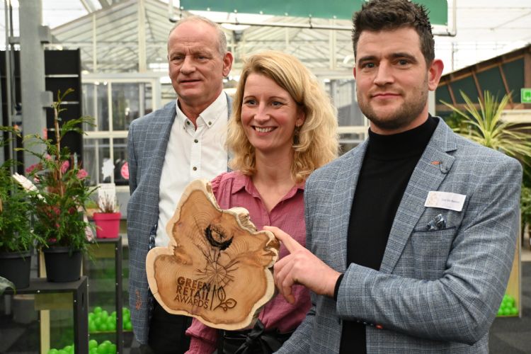 | | Hans, Marije en Jos Verboom met de trofee voor de winnende Helleborus |