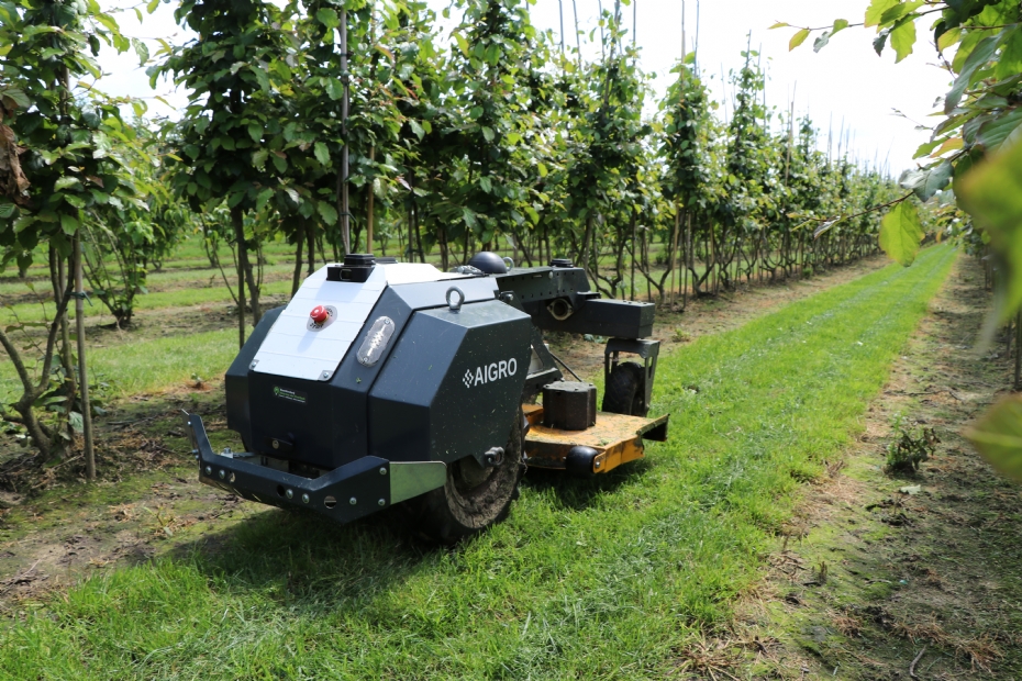De Aigro Up-maairobot kan geheel autonoom op basis van gps de grasbanen tussen de bomen onderhouden.