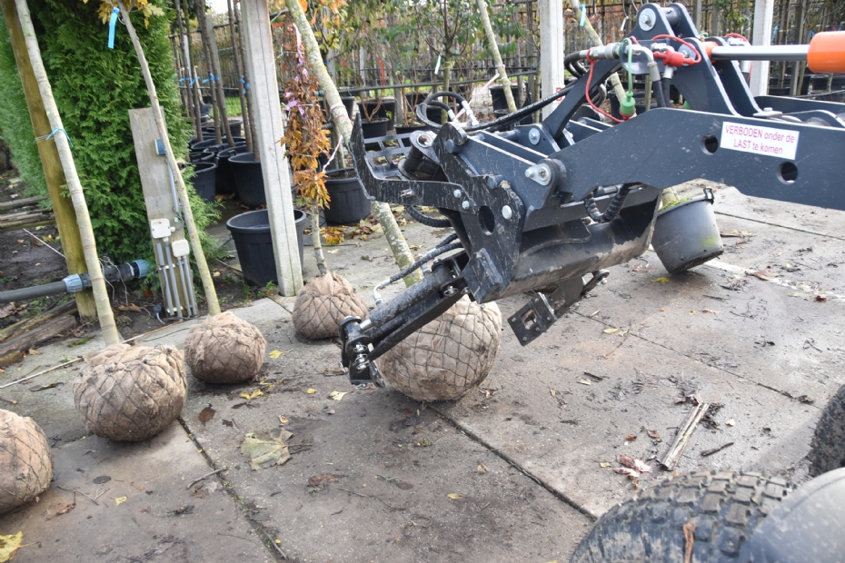 Hiernaast heeft Mabo Boomkwekerijen nog eens 3 hectare containerteelt, waardoor ze dit plantmateriaal jaarrond kunnen leveren. Het veredelen op onderstam voeren ze hier zelf uit. De stekken staan dan eerst in potten van 3 liter en worden op pallets geplaatst. (Over)geplaatst in potten van 10 liter zijn ze voor eigen gebruik voor de vollegrondsteelten van de boomkwekerij. Voor de handel levert deze boomkwekerij bomen in containers vanaf 35 liter. Mauritz licht toe: 'Circa 70 à 80 procent hiervan is vormboom. De grootste containers die je hier aantreft, zijn 90 liter. In het containerveld is de rijafstand 120 centimeter, zodat we aparte velgen hebben moeten laten maken voor de Knikmops 180E, om hiermee tussen de rijen door te kunnen manoeuvreren.'