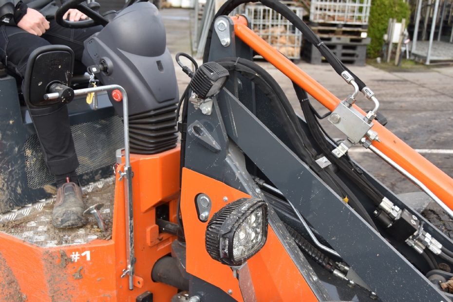 Uiteraard laat Mauritz graag hun nieuwe aanschaf in werking zien. De glimmende kniklader staat op gazonbanden, gemonteerd op speciale velgen. Immers, de Relly 1.3C staat standaard op een spoorbreedte van 180 centimeter, maar deze kwekerij hanteert 120 centimeter als standaard in teelten. Functies als de Smart Modus en het proportioneel bedienbare ventielenblok maken de kniklader zeer gebruiksvriendelijk en controleerbaar. Hij laat zien dat deze minishovel zeer wendbaar is. Dat komt volgens hem door een laag draaipunt en een compact ontwerp. Er is een goed zicht op de aanbouwdelen vanaf de stoel. Dat maakt het bedienen veiliger en efficiënter. Daarin spelen de verstelbare stuurkolom en de joystickbediening eveneens een belangrijke rol. Mauritz benadrukt het gemakkelijke op- en afstappen: 'Bovendien geeft de goed geveerde stoel je een fijne werkplek voor een lange werkdag. Vanaf de zitplaats heb je een goed overzicht op de bomenklem. De machine hebben we laten voorzien van ledverlichting die zowel voor- als achterop voor een bak licht zorgt. Nu blijven we met deze machine op de kwekerij, maar voor het geval dát, hebben we hem toch van een gele kentekenplaat voorzien. Ik durf alle medewerkers hiermee op pad te sturen, omdat ie volledig hufterproof is. En daarmee bedoel ik ook dat een dergelijke machine na tal van jaren intensief gebruik nog een tweede leven moeten kunnen krijgen, dus duurzaam is.'
