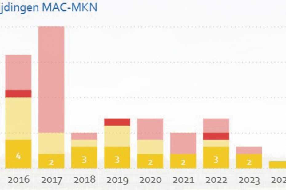 | | In de grafiek zien we het totaal aantal overschrijdingen van de MAC-MKN-norm van alle gewasbeschermingsmiddelen bij elkaar. In het donker- en lichtgeel het aantal concentratie-overschrijdingen ter grootte van één tot vijf keer boven de norm, in het donker |