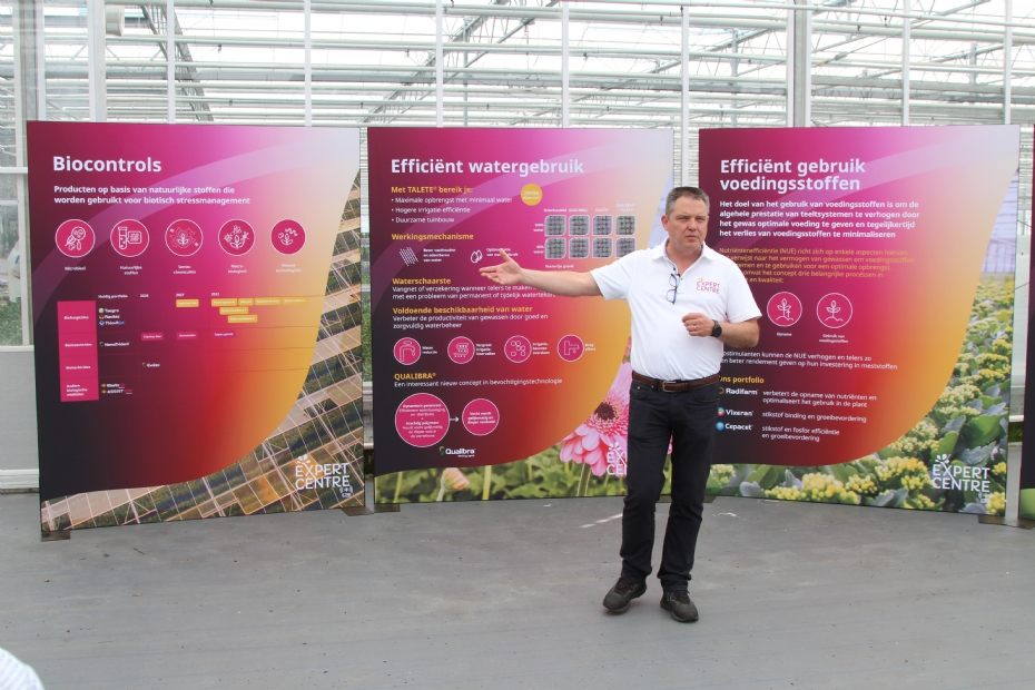 Van den Hoeks collega Marcel Hubers licht de totstandkoming van het Expert Centre Live toe. 'Via het online Expert Centre Sierteelt en het Biologicals-platform deelt Syngenta sinds 2020 kennis en inzichten over duurzaamheidsthema's zoals IPM, resistentiemanagement, de inzet van biologicals, spuittechniek, hulpstoffen en emissiebeperking. Vorig jaar ontstond het idee om die platforms samen met enkele partners tot leven te brengen in een praktijkomgeving. We hebben het voorgelegd aan Hoogeveen Plants en Van Iperen, die het ook zagen zitten. Daar is op doorgepakt en daarom kunnen de CEMMPs hier vandaag te gast zijn.'