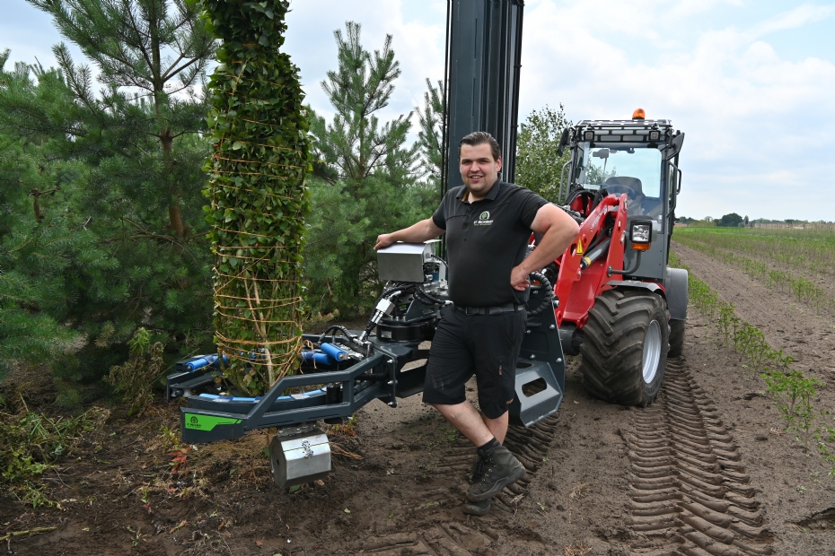 We gaan verder met DT Machinery en hun bindmachine. Deze bindmachine is geschikt voor bomen met een diameter van 1 tot 1,5 meter, is eenvoudig te bedienen en bindt de boom in enkele slagen compact in. De bindmachine is een aanbouwdeel voor een kniklader.