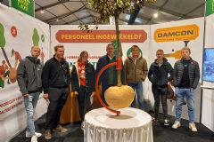Damcon laat een prototype van hun Tree Wrapper zien, die het zware werk van kluiten verpakken uit handen neemt. In onderstaand filmpje is te zien hoe nu nog enigszins handmatig de kluit verpakt wordt. Uiteindelijk is de bedoeling dat dat volledig door de machine wordt overgenomen. Damcon maakt hierbij gebruik van een volledig afbreekbaar materiaal op basis van cellulose.
