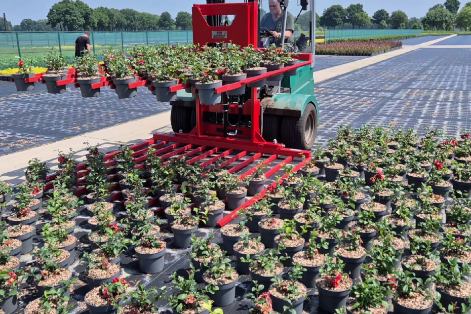 De interesse van andere potentiële klanten was intussen gewekt. Het volgende wapenfeit van Huijbregts betrof de gepatenteerde wijderzetvork, die op GrootGroenPlus van 2023 werd geïntroduceerd. Met de vorken kunnen potten eenvoudig op afstand worden gezet. De potten worden in een patroon geplaatst door de helft van de potten uit het pakket te heffen. Tussen de potten zit telkens een tussenruimte van één pot. 'Deze machine was destijds helemaal nieuw,' aldus Huijbregts, 'en viel enorm in de smaak op de beurs. Vanaf dat moment is het hard gegaan. Inmiddels maken we de wijderzetvorken met een heel team en maken we ook verschillende andere machines.'