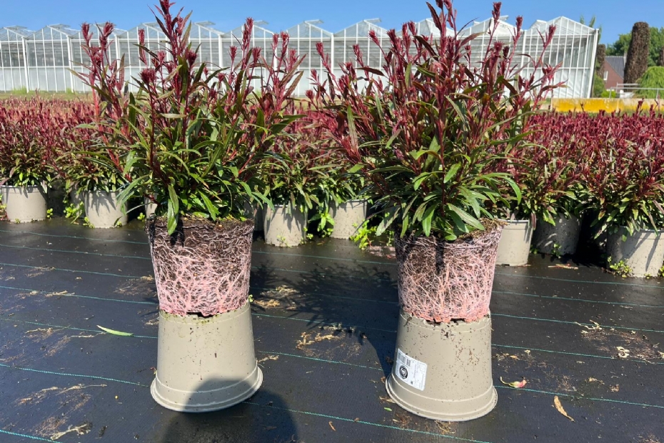 De resultaten waren verrassend goed. 'De planten gingen sneller aan de wortel en we hadden eigenlijk geen problemen met droge potten', vertelt Rovers. 'De planten stonden zelfs iets eerder in bloei en bleven compacter, wat voor onze soorten juist gunstig is. Je moet er wel iets korter op zitten met water en voeding, en de potten zijn wat zwaarder, maar verder viel het erg mee. Voor korte, snelle teelten zoals bij ons werkt dit prima.' De proef smaakt naar meer. 'De resultaten geven ons vertrouwen voor de toekomst', zegt Rovers. 'Volgend jaar willen we mogelijk opnieuw testen, met andere potmaten of gewassen. De markt vraagt er nog niet direct om, maar wij weten nu dat we er klaar voor zijn zodra die omslag komt.'