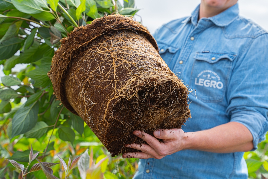 Ook Boomkwekerij M. Van den Oever, een vaste partner van Legro, zet serieuze stappen richting veenvrij telen. 'We gebruiken al mengsels die grotendeels uit hernieuwbare grondstoffen bestaan', vertelt mede-eigenaar Rens van den Oever. 'Daarnaast loopt er dit jaar een proef met verschillende gewassen in een volledig veenvrij mengsel van houtvezel en andere hernieuwbare componenten.' De beweegreden is helder: toekomstbestendigheid. 'We willen voorbereid zijn op mogelijke Europese restricties rondom veengebruik, zodat we vrij kunnen blijven exporteren', legt Van den Oever uit. 'Tegelijk moeten we breder kijken: duurzaamheid draait niet alleen om veen, maar om de hele footprint van een product.' De samenwerking met Legro noemt hij 'constructief en positief'. 'Samen zetten we verantwoorde stappen zonder concessies te doen aan kwaliteit.' De eerste resultaten stemmen hoopvol. 'We zien juist een betere wortelontwikkeling', zegt hij. 'De mengsels laten water makkelijker los, waardoor de wortels actiever groeien. Wij telen liever iets droger; dat voorkomt veel wortelproblemen. Met ons druppelirrigatiesysteem kunnen we de watergift bovendien goed doseren.' Ook de proef met 100 procent hernieuwbare grondstoffen verloopt naar wens. 'De planten doen het goed, al is de lengtegroei iets minder', aldus Van den Oever. 'Bemesting blijft een aandachtspunt, maar technisch gezien kunnen we hiermee verder. Ons doel is om in 2030 volledig te kunnen kweken op hernieuwbare grondstoffen. Toch hoop ik dat er ruimte blijft om een klein percentage veen te gebruiken. Dat blijft een unieke grondstof voor een goed substraat.'