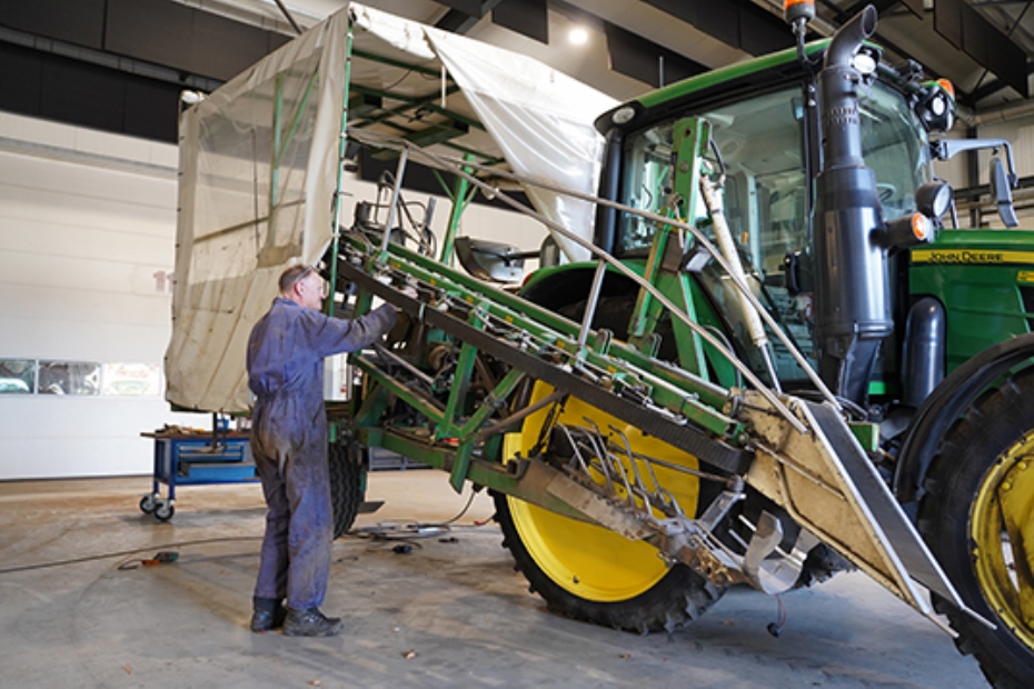 | | In de werkplaats is een medewerker bezig aanpassingen door te voeren aan een klembandrooier voor rozenstruiken |