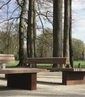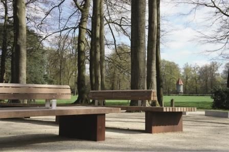 De zitbanken van 600 x 100 cm maken deel uit van de Solid Serie uit de Streetlife Collectie. De naam Solid 12 verwijst naar de zitting, opgebouwd uit 12 FSC hardhouten balken van 70x70 mm, gemonteerd op de patenteerde Streetlock-kammen. Door het brede zitvlak van bijna één meter kan men tweezijdig zitten. De Soft Back-leuning in het midden kenmerkt zich door de bolgeschaafde beëindiging, waardoor de bank een zachtere vorm krijgt en het zitcomfort wordt verhoogd. De warme kleur van de CorTen-stalen jukken, met verdekte ondergrondse verankering, dragen bij aan de natuurlijke uitstraling. De royale banken nodigen uit tot het nemen van een moment van rust en bezinning in dit historische landschap.