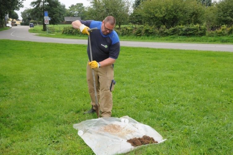 Rondeel maakt met een eenvoudige grondboor bodemprofielen. Deze stalt hij netjes voor zich op een plastic zeiltje en neemt vervolgens op de verschillende dieptes monsters.