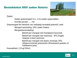 Een bestek of werk wordt geschreven met oog voor kwaliteit. Om deze kwaliteit te waarborgen biedt DSV zaden bestekteksten aan voor al haar grasmengsels. Met deze bestekteksten kan per gebruiksdoeleinde het geschikte mengsel worden voorgeschreven. Opgevraagde teksten zijn altijd up-to-date, sluiten geen bedrijven uit en geven zodoende de zekerheid dat het geleverde mengsel ook daadwerkelijk voldoet aan de gebruiksdoeleinden van het project. De bestekteksten kunt u vrijblijvend aanvragen voor de door u gevraagde gebruiksdoeleinden. via de website