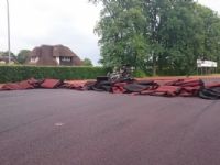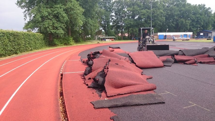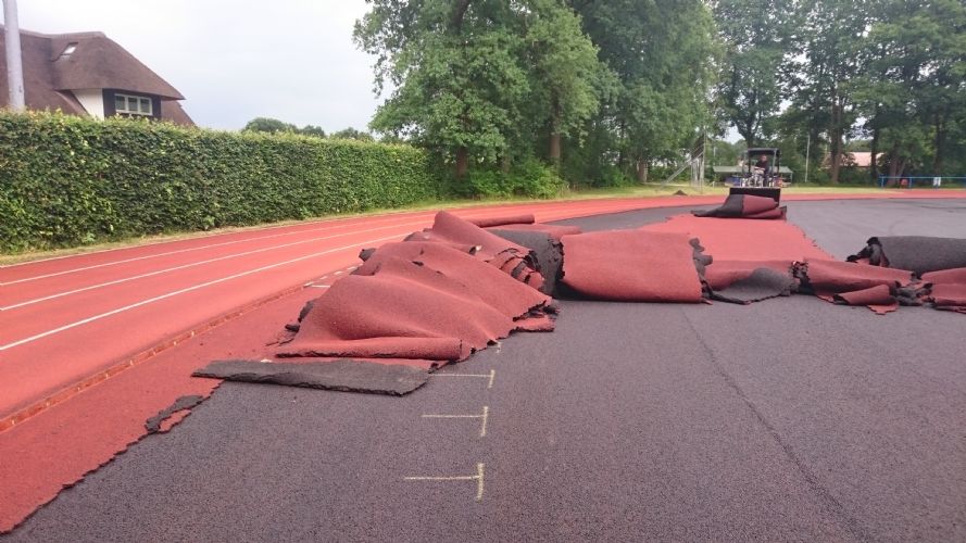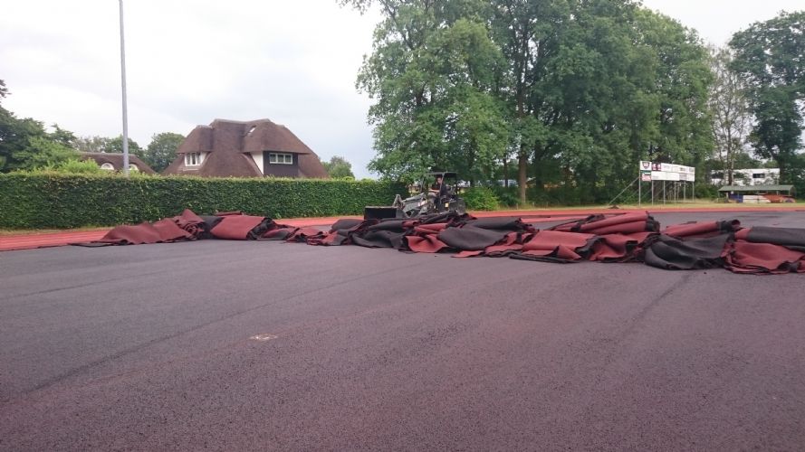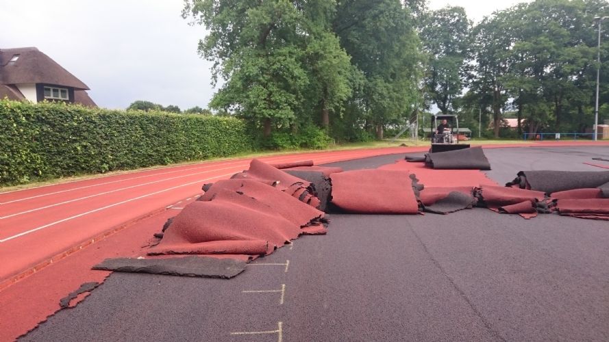 Het aanbrengen van nieuwe toplaag op 6 laans kunststof Atletiekbaan in Heerde. De atletiekbaan is aangelegd in 2005 en is vanwege scheurvorming in de kunststof toplaag vervroegd voorzien van een geheel nieuwe kunststof toplaag.