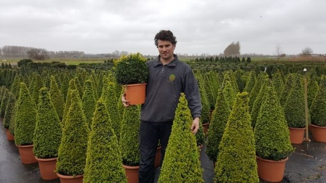 Om te onderzoeken of dit voorkomen kon worden met gecontroleerd vrijkomende meststoffen, werkte het bedrijf van Manders nauw samen met Jo Slijpen van Ekompany. Opzet en toepassing 'Faulkner' groeit iets anders dan Sempervirens. 'Faulkner' wordt iets later groen, waarbij het op kleur houden van de plant gedurende de winterperiode vaak problematisch is. Dit is een gevolg van tekorten in de voeding. 'In de proef hebben we een product toegepast met een looptijd van vier tot vijf maanden, dat gedurende die periode continu voeding afgeeft. De plant krijgt dus iedere dag een beetje voeding zonder pieken, in plaats van in korte tijd heel veel of te weinig, zoals bij conventionele bemesting vaak het geval is', legt Jo Slijpen van Ekompany uit. 'Specifiek gaat het om een NK-meststof (18-0-16+3MgO), waarvan de stikstof en het kalium gedeeltelijk (75-80%) zijn gecoat. De dosering per hectare voor deze meststof was 525 kg.' Bodemleven en uitspoeling Tonton Buxus heeft veel aandacht voor het bodemleven. 'Het is natuurlijk algemeen bekend dat het bodemleven van groot belang is en dat we als telers hierbij onze verantwoordelijkheid moeten nemen', aldus Manders. 'Daarom gebruiken wij als basis organische bemesting. In ons geval is dit een 8-3-3-variant, waarvan 1200 kg per hectare is toegepast in drie werkgangen. Het voordeel van deze meststof is dat op deze manier ook het bodemleven wordt gevoed, wat op termijn zorgt voor een gezonde voedingsbodem. Een nadeel is echter dat deze meststoffen snel uitspoelen, waardoor de plant vaak onvoldoende voeding krijgt. Dit zagen we in ons geval terug in de winterkleur. Daarom dien ik ook bijbemesting toe in de vorm van Ekote-gecontroleerd vrijkomende meststoffen.'