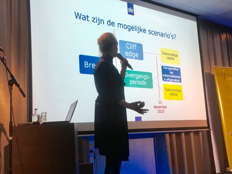 | | Brexit-coördinator Hillefien Strijland spreekt namens het ministerie van Landbouw de aanwezigen toe bij de informatiebijeenkomst van Naktuinbouw in Tiel |