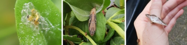 Van jonge rups, tot pop en uiteindelijk tot vlinder. Levensloop Buxusmot. (Bron: Eline Arts)