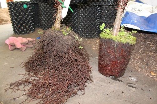 Links het wortelgestel van de Araucaria araucana uit de airpot en rechts de wortels uit een dichte pot.