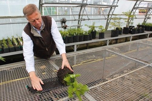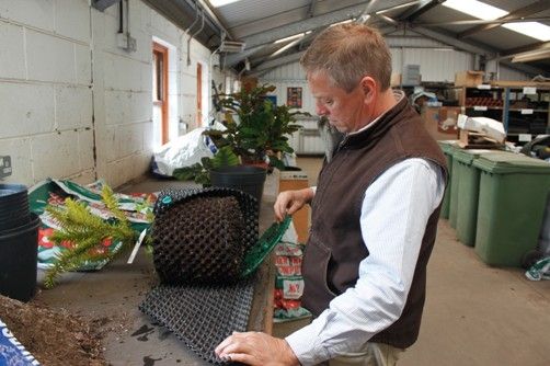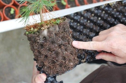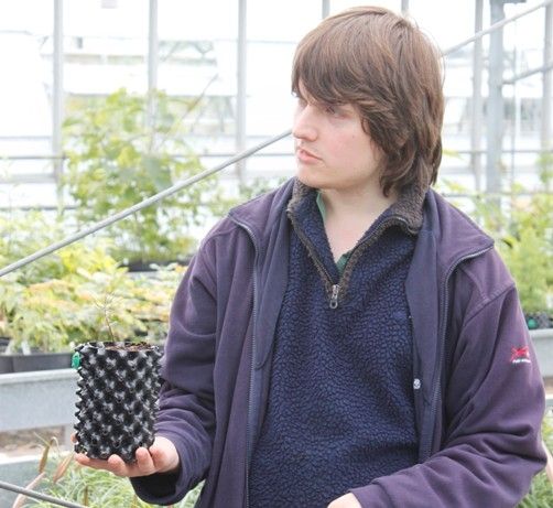 Airpot-producent Jamie Single bekijkt het wortelgestel van een Araucaria araucana in airpot.