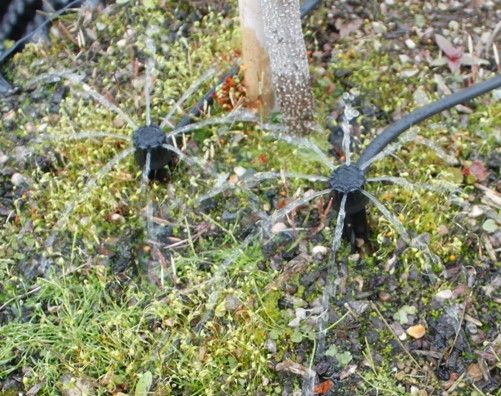 Detailfoto van de 360-graden sproeikoppen in actie.