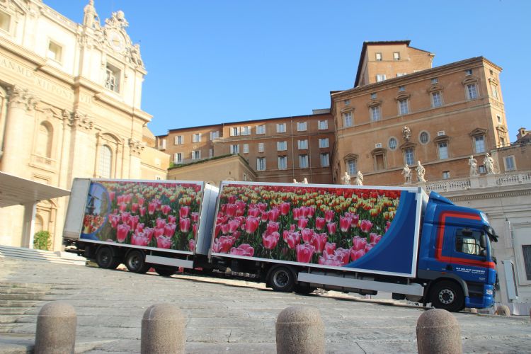 Het transport is nog een heel gepuzzel, vertelt Jasper. 'Dat gaat met koelwagens. Eerst worden de bomen opgeladen. Dan gaan ze naar de Keukenhof in Lisse, waar de bloemen erbij komen.' De lading die de reis maakt richting Vaticaanstad, wordt zelfs ingezegend, vertelt Paul Deckers. 'Toen ik in 2015 hoofdarrangeur werd, vond ik dat het vertrek van de bloemen voor de Paus wel wat meer aandacht mocht hebben. Ik heb contact gezocht met directeur Bart Siemerink van de Keukenhof en hem vervolgens mijn plan voorgelegd. Vanaf 2017 vertrekken de bloemen op dinsdag in de Goede Week vanaf de Keukenhof naar Rome nadat ze zijn gezegend voor een behouden vaart door de bisschop van Rotterdam, monseigneur Van den Hende. Daarbij zijn alle betrokkenen en pers uitgenodigd.'
