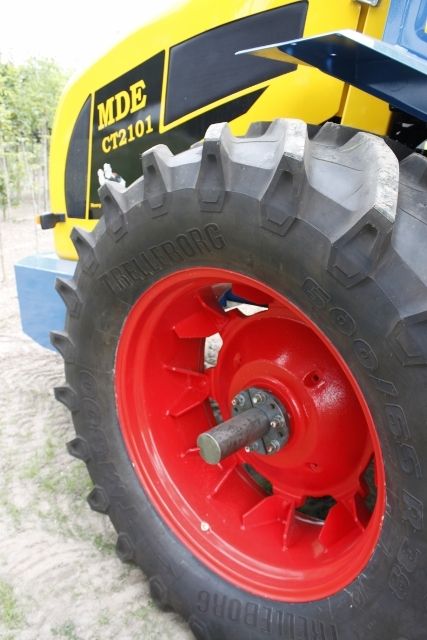 | | De banden, in de maat 600/65x38”, zijn van fabrikant Pirelli. De gietijzeren velgschotel is van Amerikaanse makelij. De totale velg weegt 400 kilo. De schuifasconstructie is om de spoorbreedte te verstellen. |