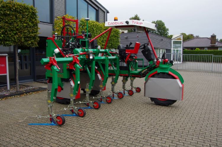De portaaltrekkers zijn er in grote lijnen in twee uitvoeringen: met drie en met vier wielen. De GlobusTrike heeft drie wielen in een zijspanopstelling. Dus voor- en achterwiel in elkaars verlengde en dan opzij nog een derde wiel. Hierdoor is de Trike een stabiele en wendbare portaaltrekker die ook geschikt is voor het 3-rijig teeltsysteem. De GlobusTrike heeft ook een chauffeursstoel, maar hoeft niet per se met bestuurder bediend te worden, omdat deze volautomatisch op gps rijdt. Jan: 'Tachtig tot negentig procent van onze machines wordt afgeleverd met gps-besturing. De trekkers hebben een elektronisch gestuurde hydrostatische aandrijving. Voor de veiligheid moet er natuurlijk altijd iemand in de buurt zijn. Wanneer de afstandsbediening meer dan vijftien meter buiten bereik van de werktuigdrager is, stopt deze automatisch.' De GlobusTrac bereikt een snelheid van 25 km/u, de Trike haalt 15 km/u. Ze worden uitgevoerd met en zonder cabine, met airco en/of met overdrukcabine met koolstoffilters.