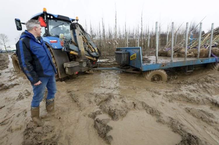 Met grote moeite en tot de assen weggezakt ploegt een zware tractor van Betuwe Boomkwekerij uit Opheusden eind februari door de modder op een kweekperceel in Ochten. Na maanden van regenval zit de agrarische sector met de handen in het haar. Boeren kunnen hun mest niet uitrijden en het land bewerken en boomkwekers trekken met hun machines kniediepe voren op de percelen.