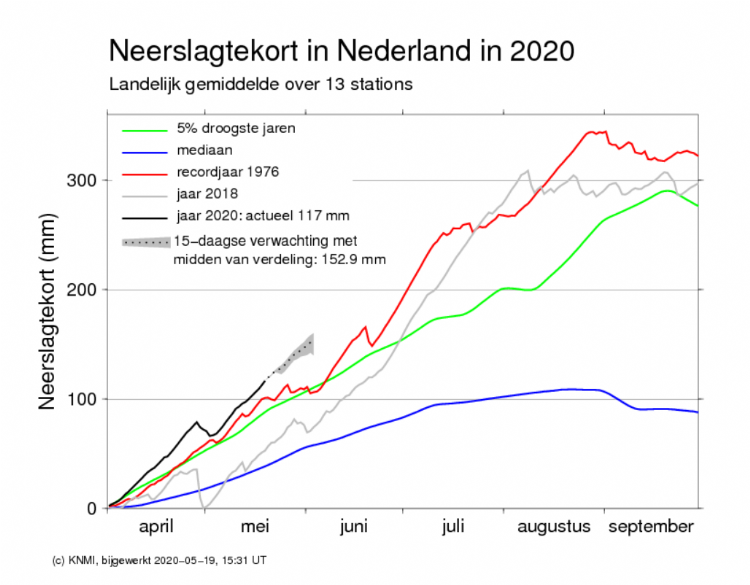 Het KNMI voorspelt dat de het neerslagtekort begin juni zal uitkomen rond de 135 mm. Een tekort wat in 1976 pas halverwege juni werd bereikt. Het lijkt er dan ook op dat 2020 zo'n twee weken vooroploopt qua droogte dan het recordjaar 1976. Vanaf de start van het 'droogteseizoen' loopt 2020 structureel voor qua droogte ten opzichte van 1976.