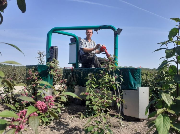 Hij vervolgt: 'We zijn in juni dit jaar begonnen met de Globus-e-trike. Hiermee kunnen we twee rijen tegelijk behandelen en is onze capaciteit dus verdubbeld. En we hoeven niet te lopen. In de hete zomerweken komt er een parasolletje op en rijden maar. We zijn er erg tevreden over. In onze snijheesters hebben we nog geen herbicides hoeven te gebruiken, mede door het gebruik van deze schoffel. De schoffel haalt zeker 80 tot 90 procent van het onkruid weg. Naast het schoffelsysteem zitten er enkele torsiewieders op. Wij hebben best veel houtige gewassen en qua capaciteit voldoet de e-trike meer dan voldoende.'