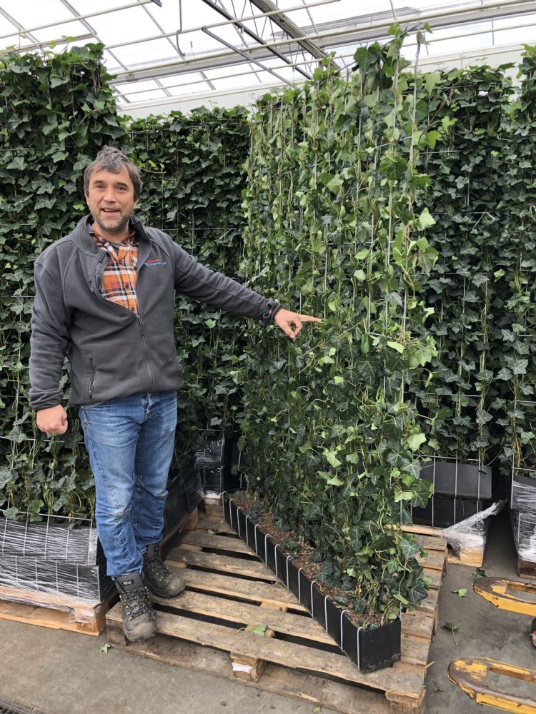 Mathijssen vertelt verder: 'Ik begon net voor het jaar 2000 voor mezelf, alleen, met een breed assortiment aan planten. Gaandeweg ontdekte ik dat specialiseren mij beter lag. Wij kozen voor Hedera hibernica. In 2005 betrok ik Jeroen van Beurden erbij als vennoot en vanaf die tijd hebben we ons steeds meer op Hedera toegespitst. Sinds 2010 hebben we bijna alleen nog maar Hedera. Alle Hedera die wij kweken, is bedoeld voor hagen. We zijn begonnen met de stokken, die door de eindklant tegen een schutting, hekwerk of muur worden geplaatst. Toen kwamen er de kant-en-klare hagen bij. Als het gaat om Hedera gaat, bieden we dus een totaalpakket aan: van 40 centimeter tot 3 meter aan stok en kant-en-klare hagen. Wat een klant ook zoekt, als het om Hedera gaat, kunnen wij hem tevreden stellen.'