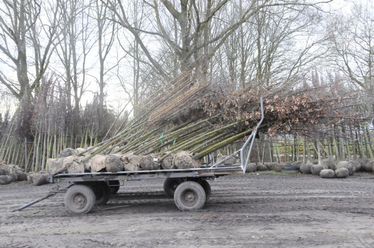 Ook in de kwekerij zelf heeft De Jong nog wel een aantal jaren werk. Ik rij met hem naar een van zijn percelen om zijn bomen te bekijken. De Hilver heeft twee grote productgroepen. De eerste bestaat uit laanbomen tot de maat 20-25 in de meer gangbare soorten als eik, berk en beuk en bijvoorbeeld Gleditsia. De soortkeuze is afgestemd op het zand. Veel sortiment in Acer is er daarom bijvoorbeeld niet te vinden. Wel een gouwe ouwe als Acer campestre 'Elsrijk'. De tweede poot van De Hilver zijn de leibomen. Het sortiment is kleiner dan bij de laanbomen, maar de verscheidenheid in vormen natuurlijk groter. De bomen worden afgezet via de bekende kwekers in binnen- en buitenland die zich richten op openbaar groen. De leibomen die uiteindelijk ook veel in particuliere tuinen terecht zullen komen, gaan vooral naar handelsbedrijven in binnen- en buitenland.