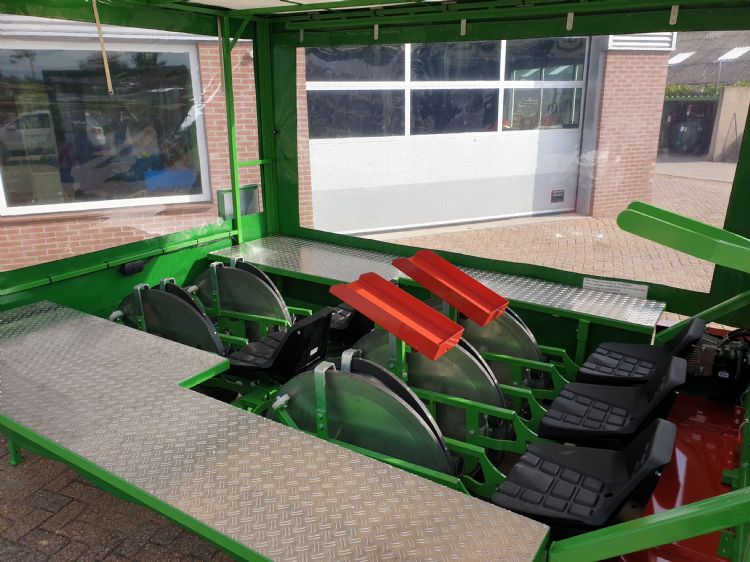 Het klantgerichte mechanisatiebedrijf gaf ook al vroeg gehoor aan de roep om een plantmachine met schijven van 100 cm, voor vier rijen op een bed. Bij fruitboomplanters zijn de rijafstanden groter en heeft de machine een breed frame met vaak vier elementen naast elkaar. Bij de kleinere schijfplanter is daarvoor een tandemframe ontwikkeld met twee posities voor en twee achter, alle in de rijrichting. Voor de grote schijfplanter zou dat een langer frame vergen, wat iets lastiger is voor de trekker. Een praktische oplossing werd gevonden door twee elementen om te draaien, zodat de vier planters tegenover elkaar zitten en de schijven op één lijn zitten. 'Het is echt een oplossing voor de boomkwekerij', merkt de directeur op. 'Hij wordt meestal toegepast in combinatie met een rijenfrees voor de trekker, zodat de grond goed langs de plantkouters gaat.'