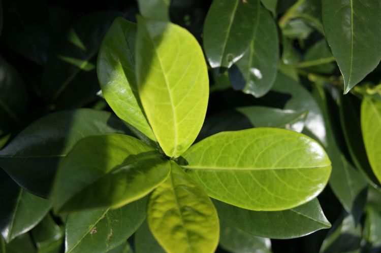 | | Close-up van het blad van Prunus laurocerasus 'Gabi' |