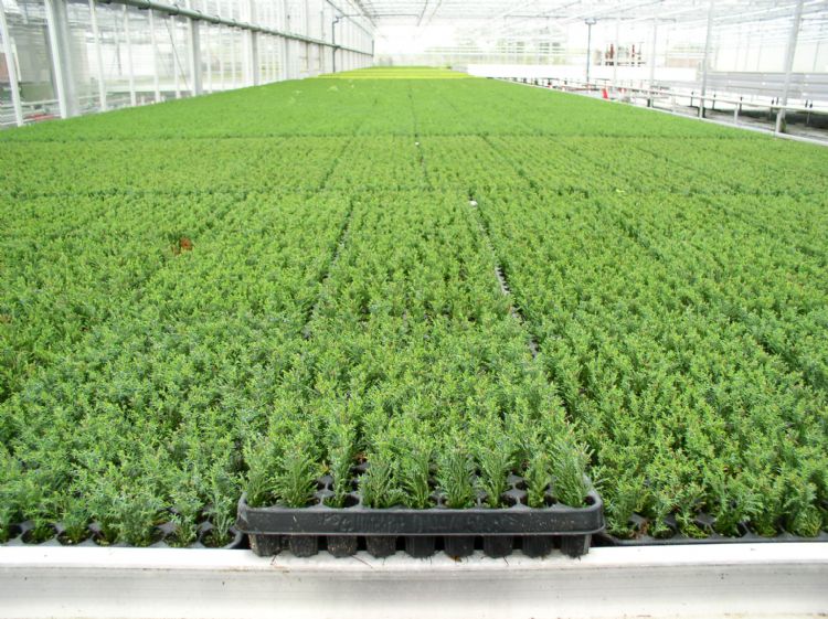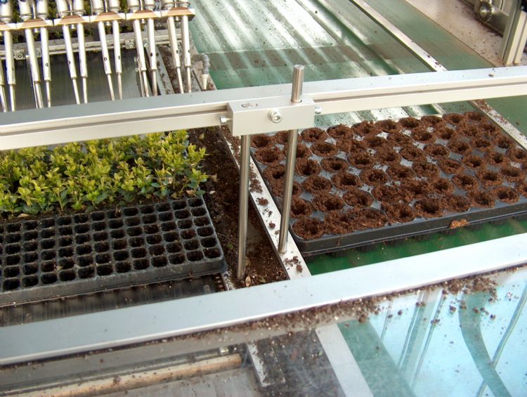 Zogenaamd pot-in-potsysteem: eerst stekken of zaaien in kleine trays (240-gaats); na de eerste beworteling worden de planten automatisch in een 60-gaats tray getransplanteerd