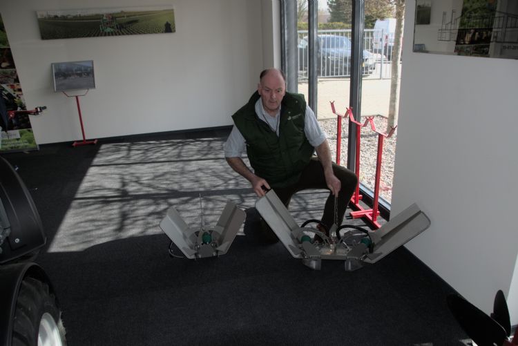 Het is goed om te zien hoe precies zo'n LVS-systeem vloeistoffen verwerkt. Het lijkt nog het meest op een kleine schijvenkunstmeststrooier. Naast de aanbouwsystemen die bestemd zijn voor zijn e-trikes laat Hinloopen ook een LVS-spuitlans zien. Vloeistofdruppels komen op de draaiende schijf terecht, die ze wegslingert, zonder dat er sprake is van drift. Hinloopen zegt hierover: 'De druppelgrootte, de toevoer en de draaisnelheid bepalen de benodigde hoeveelheid product en de bedekking. In combinatie met een e-trike levert deze pleksgewijze methode veel voordelen op, zoals besparing op middelen en tijd. Het alternatief is om dit met een grote watertank te doen, wat veel meer arbeid vergt en veel zwaarder is en dus slechter voor de teeltbodem.'